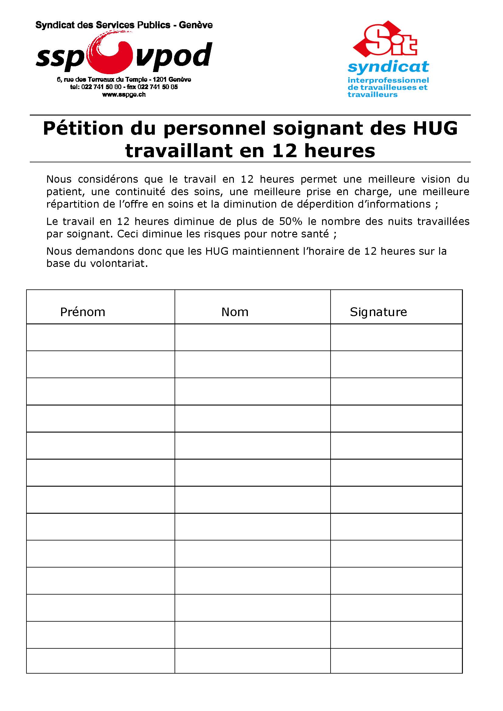 Pétition du personnel soignant des HUG travaillant en 12 heures