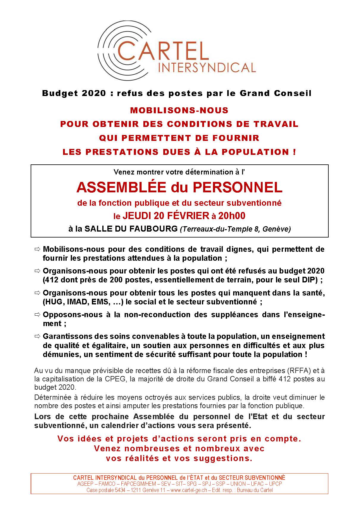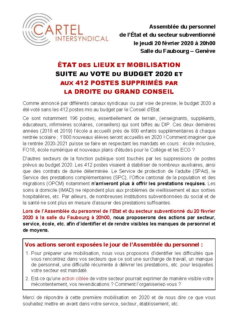Assemblée Cartel du personnel des services publics et subventionnés Jeudi 20 février, 20h, salle du Faubourg