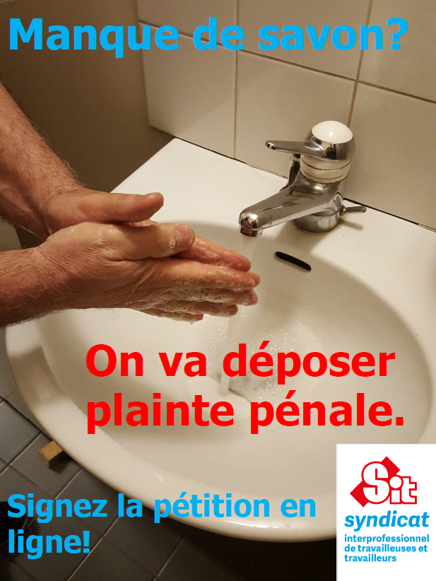 Manque de savon ? On va déposer plainte pénale ! Pour plus d’information sur l’insuffisance des contrôles sur les chantiers dans le contexte de la pandémie, lisez notre communiqué de presse du 28 avril 2020.