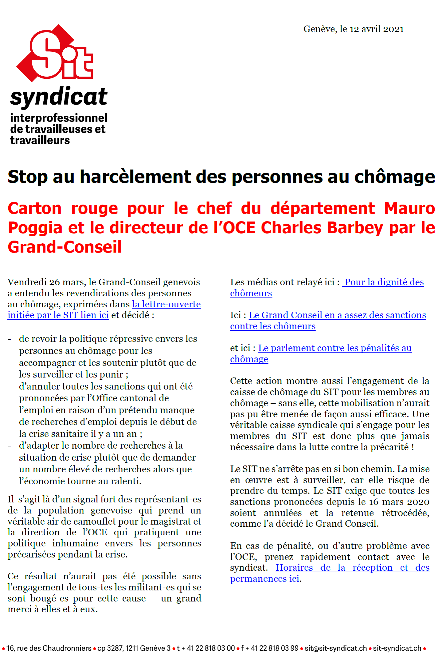 Vendredi 26 mars, le Grand-Conseil genevois a entendu les revendications des personnes au chômage, exprimées dans la lettre-ouverte initiée par le SIT lien ici et décidé :