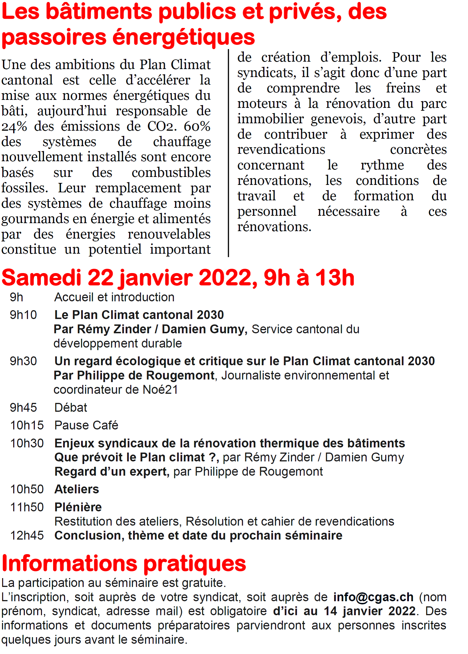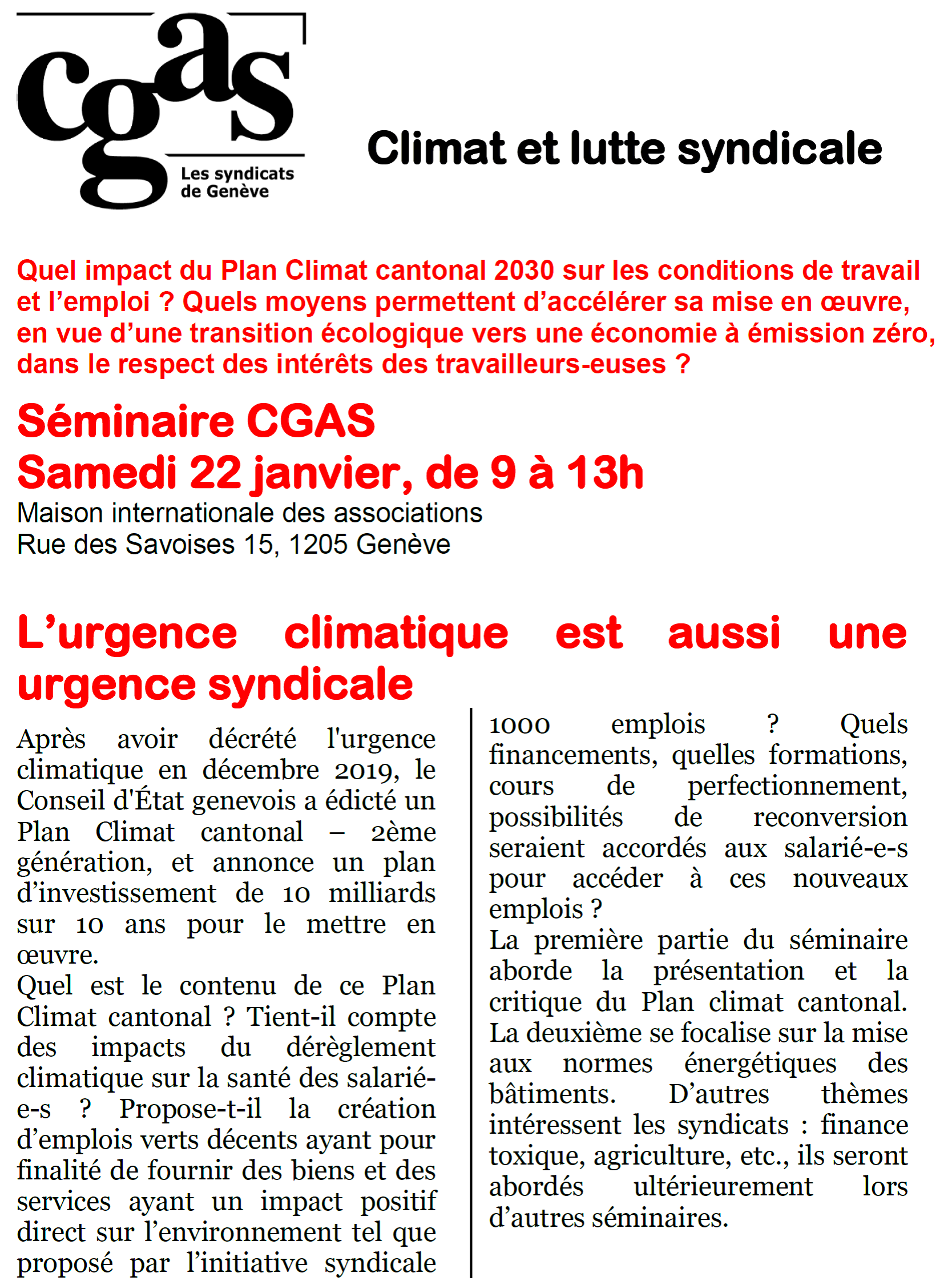 Quel impact du Plan Climat cantonal 2030 sur les conditions de travail et l’emploi ? Quels moyens permettent d’accélérer sa mise en œuvre, en vue d’une transition écologique vers une économie à émission zéro, dans le respect des intérêts des travailleurs-euses ?