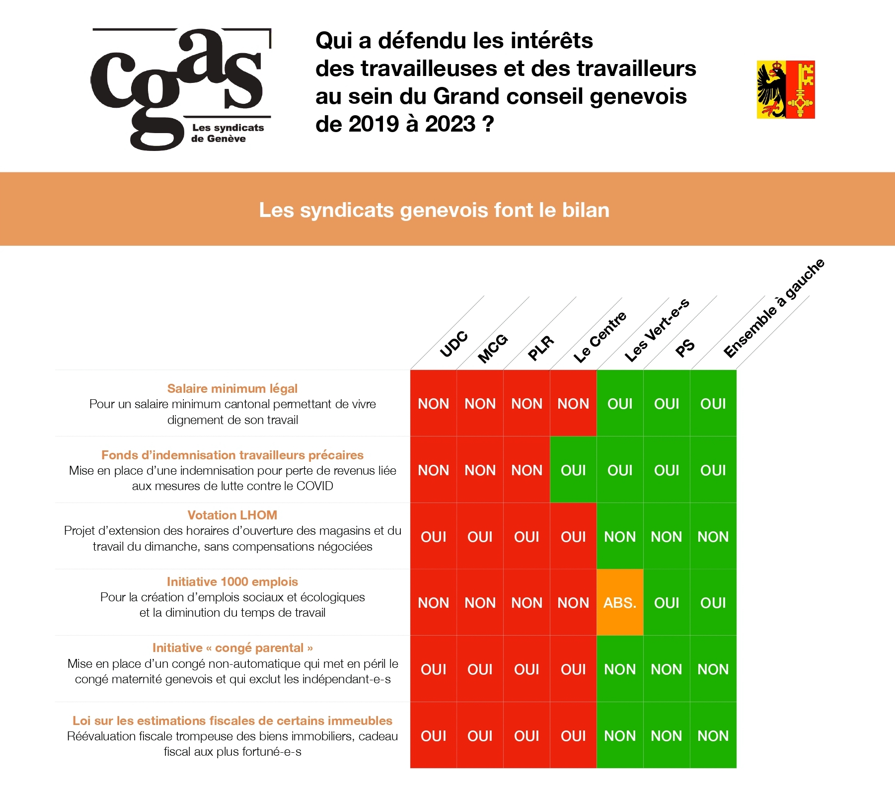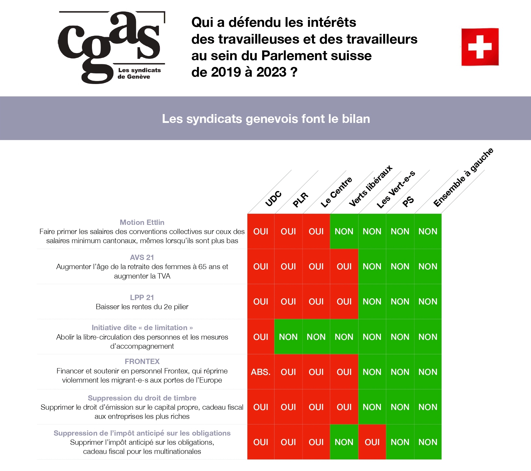 La Communauté genevoise d’action syndicale fait le bilan de la défense des intérêts des travailleuses et des travailleurs par les partis présentant des candidat-e-s aux élections fédérales.
