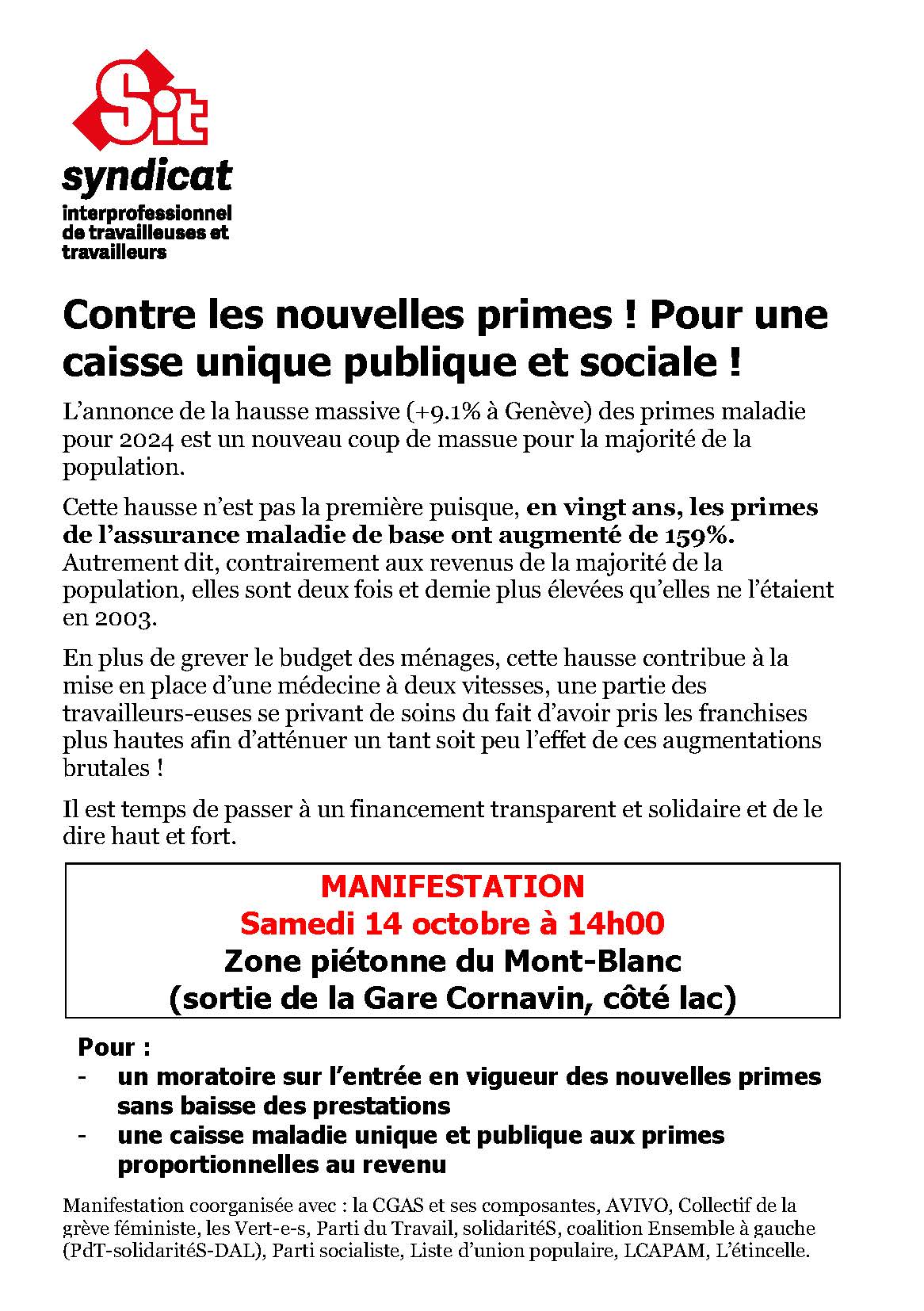 Communauté genevoise d’action syndicale (CGAS)/AVIVO/Syndicat des services publics (SSP-vpod)/UNIA/Syndicom/SYNA/Syndicat Suisse des Médias (SSM)/Association du personnel de la Confédération (APC)/Collectif de la grève féministe/Les Vert.e.s/Parti du Travail/solidaritéS/Coalition Ensemble à gauche(PdT-solidaritéS-DAL)/Parti socialiste/Liste d’union populaire/LCAPAM/L’étincelle