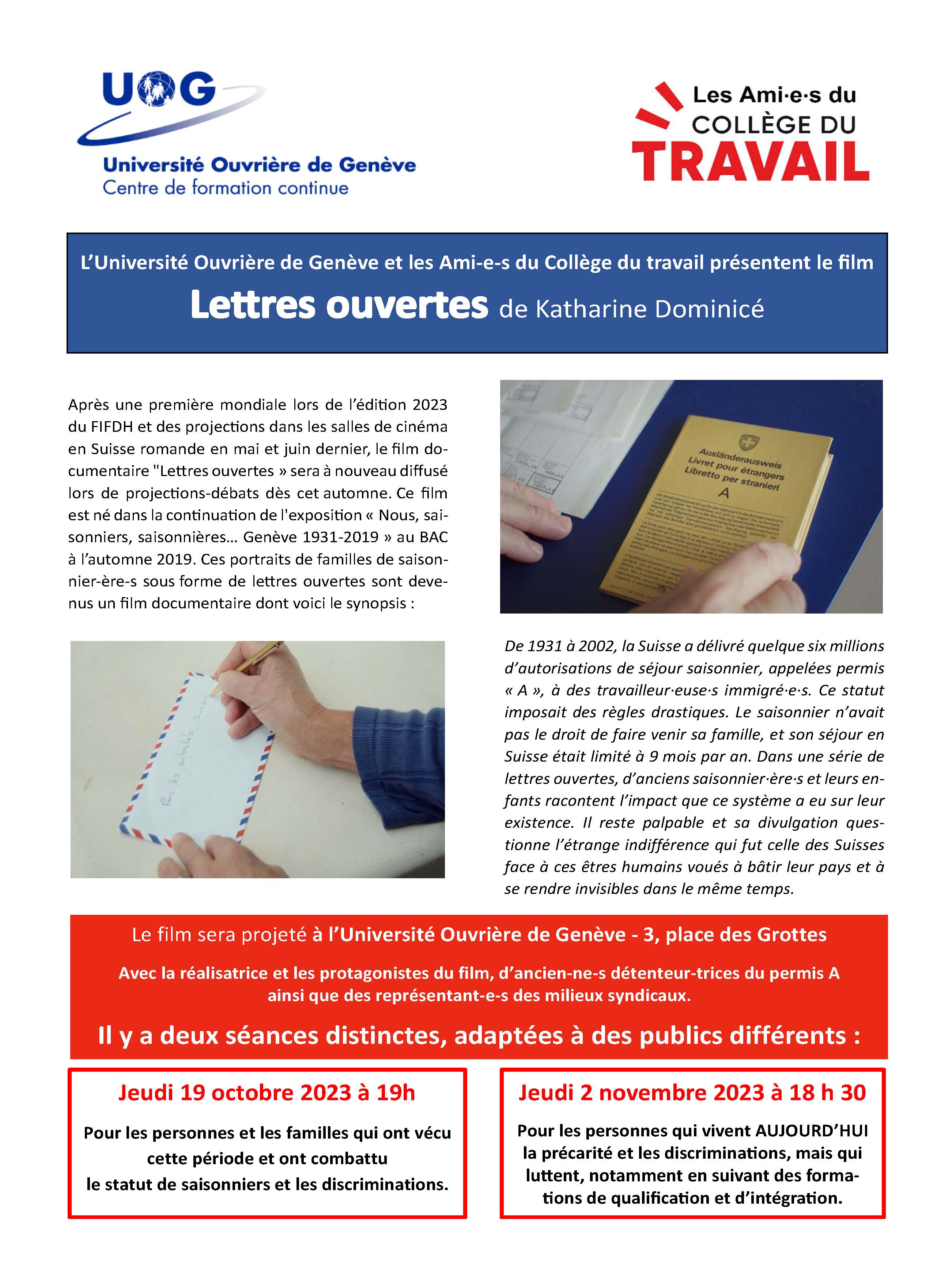 19 octobre et 2 novembre : projection du film "Lettres ouvertes" de Katharine Dominicé sur les travailleurs-euses saisonniers-ères