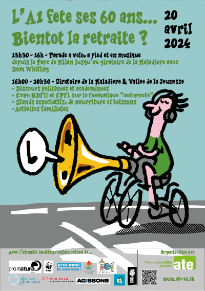 Après l’aboutissement du référendum national contre les monstres projets autoroutiers en janvier dernier, qui a récolté plus de 100’000 signatures, l’Association Transports et Environnement (ATE) du canton de Vaud organise une manifestation à l’occasion des 60 ans de l’autoroute A1 et contre son extension.