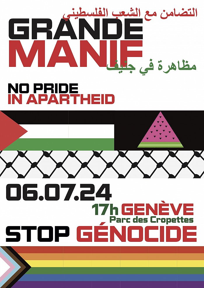 BDS (Boycott-Désinvestissement-Sanction) Genève organise une manifestation en collaboration avec le Collectif Radical d’Action Queer qui appelle à constituer un bloc "Queers for Palestine" contre le "pinkwashing" israélien. Mobilisons-nous pour exiger la fin du génocide à Gaza et pour dénoncer l’instrumentalisation des luttes LGBTQIA+ pour justifier l’apartheid israélien. No Pride in Apartheid !