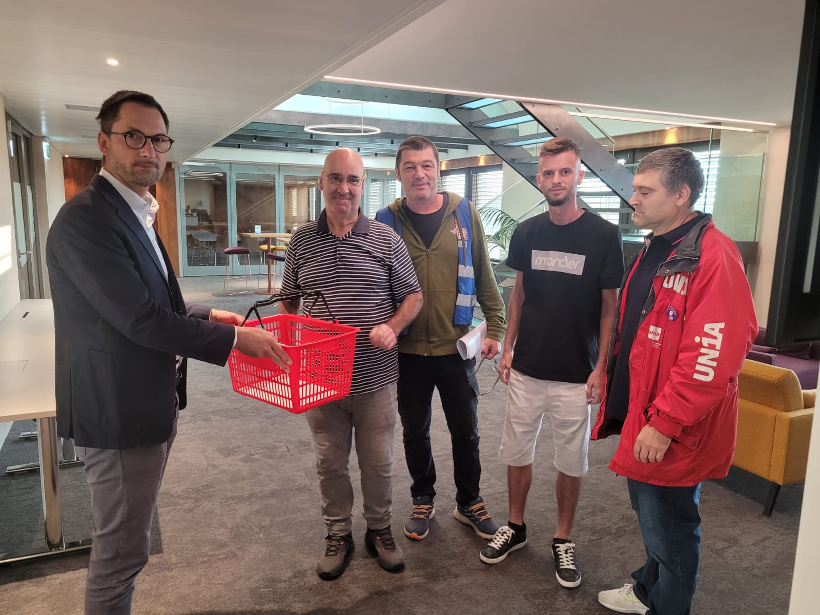 A cette occasion, la délégation a remis à titre symbolique un panier à remplir par le patronat pour l’ensemble de ses collègues, ainsi qu’une lettre, à la direction de la SSE Section-Genève. Par ce geste, elle a souhaité transmettre un signal un fort à la partie patronale que les travailleurs de la construction n’accepteront pas d’augmentations individuelles cette année – méthode qui n’a pour but que de les diviser.