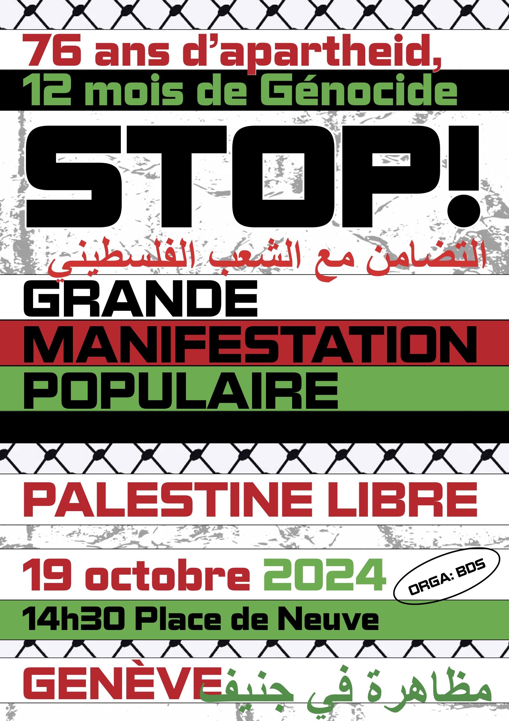 Grande manifestation populaire en solidarité avec la Palestine 19 octobre 2024 14h30, place de Neuve