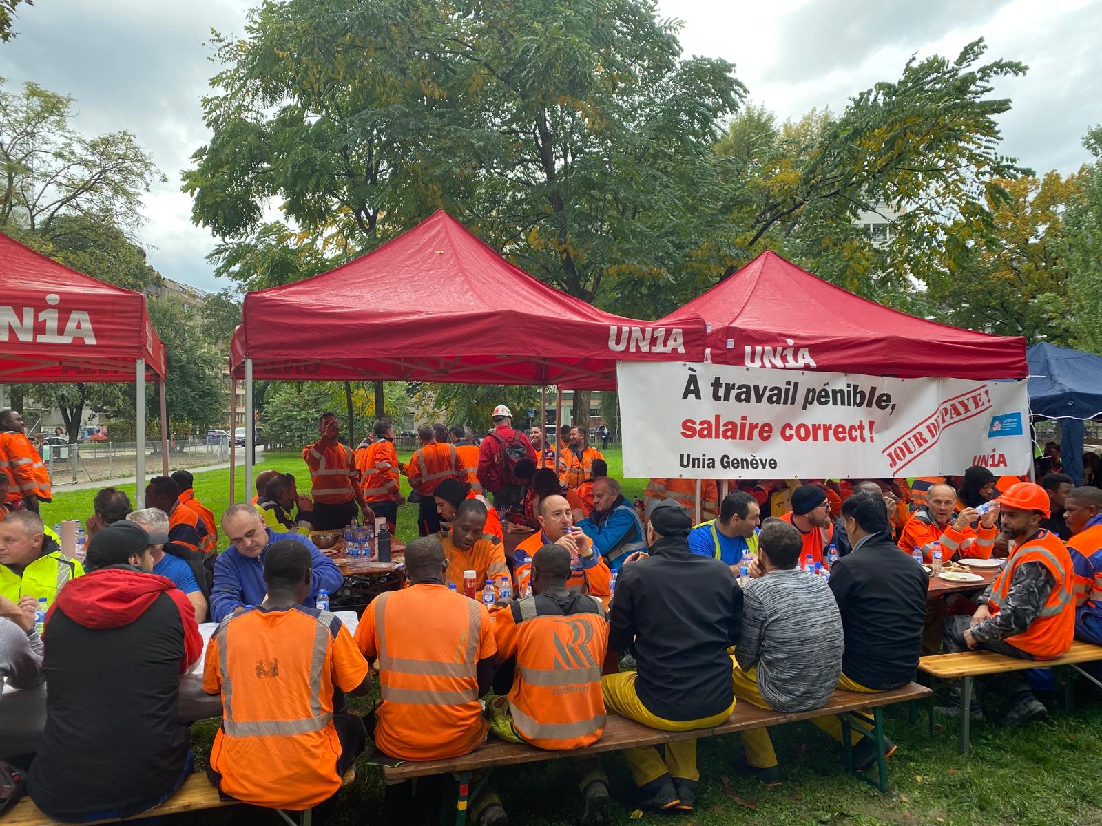 Face à l’indigence de la proposition patronale et au mépris régulièrement affiché par la SSE à leur égard ces dernières années, près de 150 travailleurs du secteur principal de la construction se sont mobilisés aujourd’hui à midi à l’appel des syndicats SIT et UNIA. Provenant de différentes entreprises, ils se sont réunis pour une grillade à proximité d’un des plus grands chantiers du canton, le PAV.
