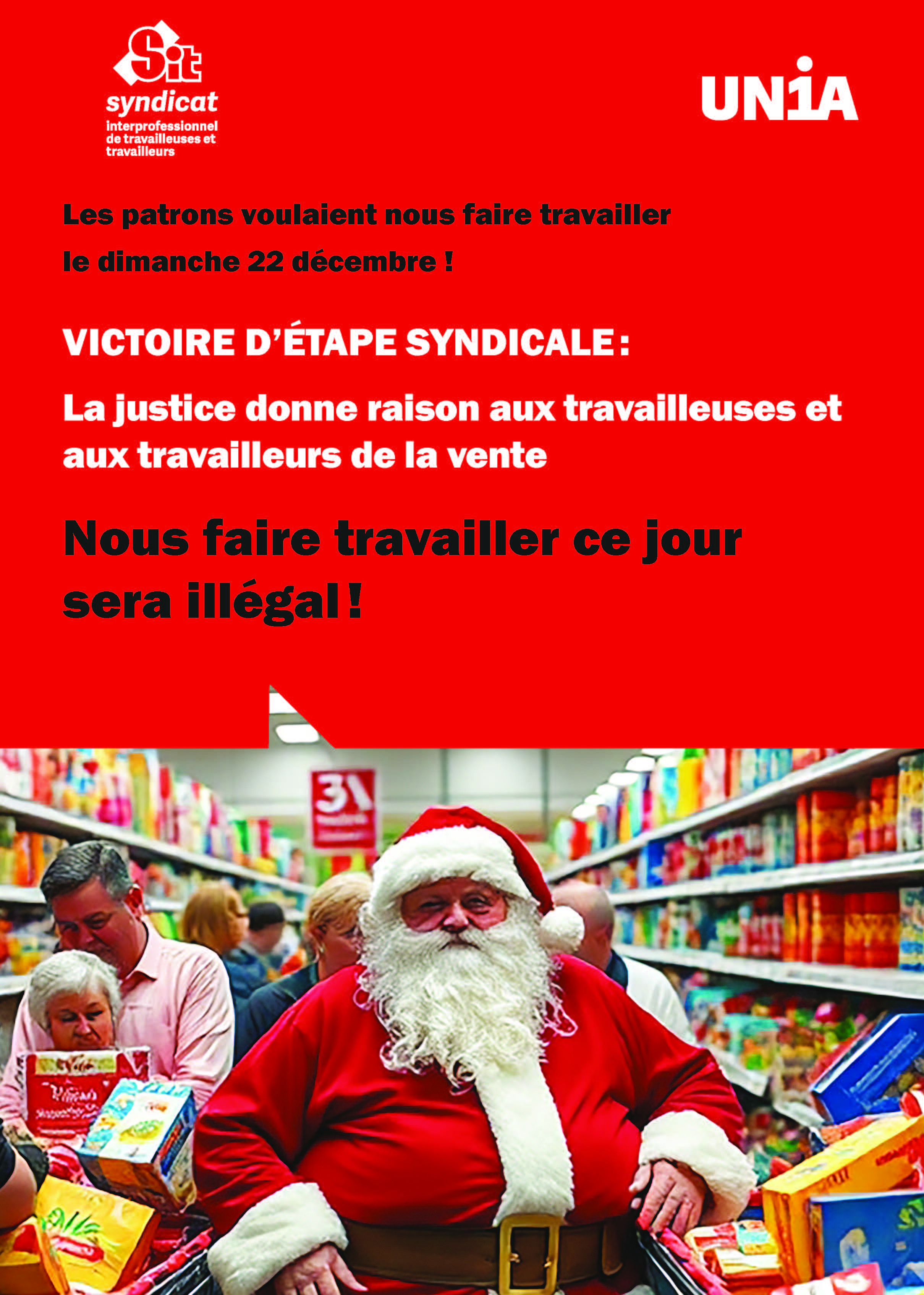 Les syndicats Unia et SIT ont obtenu gain de cause, devant la Chambre administrative de la Cour de justice, contre le projet du Département de l’économie et de l’emploi (DEE) visant à accorder une ouverture généralisée des magasins le dimanche 22 décembre 2024. Cette décision judiciaire marque un revers significatif pour le DEE qui avait estimé, à tort, que l’emploi de personnel ce jour-là pouvait se faire sans autorisation spécifique.