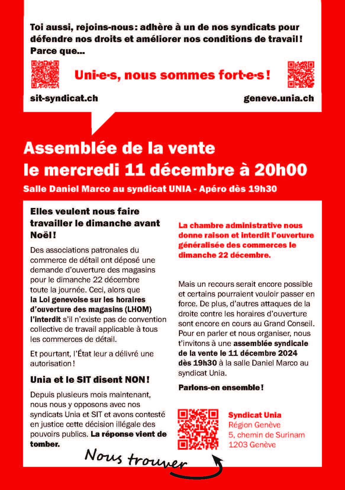 Cette victoire intervient alors que les horaires d’ouverture des magasins sont sous pression à l’échelle nationale. Plusieurs initiatives fédérales visent à étendre les horaires d’ouverture, notamment pour les dimanches, ce qui représenterait une dégradation significative des conditions de travail dans le commerce de détail. À Genève, la situation est tout aussi préoccupante, avec quatre projets de loi en discussion qui pourraient venir bouleverser les horaires d’ouverture en autorisant davantage d’assouplissements, notamment pour les dimanches et les soirées, sans offrir de garanties sociales suffisantes.