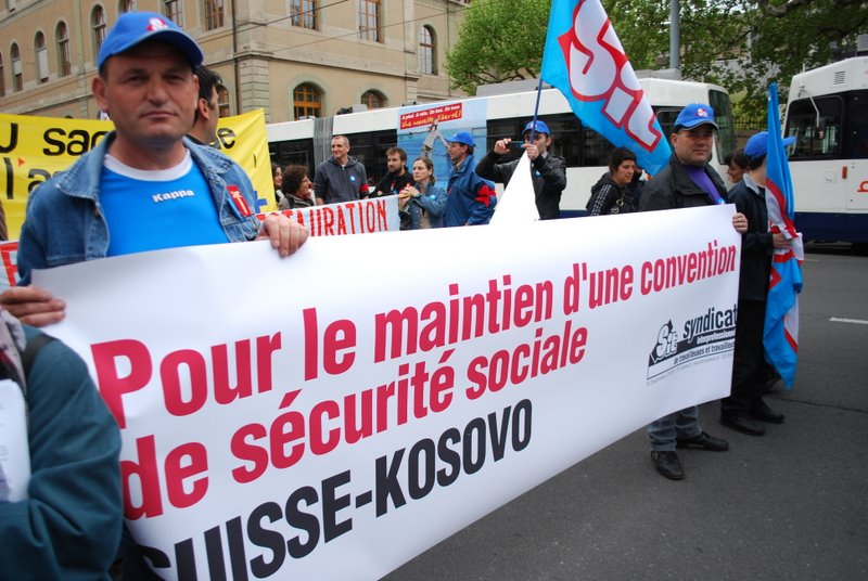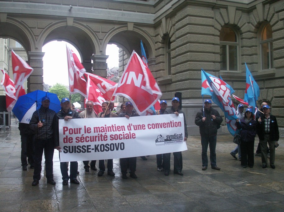 Depuis le 1er avril, les kosovars dont les enfants sont restés au pays ne reçoivent plus d’allocations familiales. Dorénavant, celles et ceux qui veulent rentrer au Kosovo pour y passer leur retraite ne peuvent plus s’y faire verser leur rentes AVS. « Il s’agit d’une grave discrimination de personnes qui ont travaillé une bonne partie de leur vie en Suisse et ne peuvent plus choisir où ils souhaitent passer leur retraite », s’est indignée Rita Schiavi, membre du Comité directeur d’Unia lors de la remise de la pétition au Conseil fédéral. Les personnes le plus pénalisées sont celles qui deviendraient invalides après seulement quelques années de vie active. Ces salarié-e-s ne reçoivent qu’un tout petit capital qui pourrait suffire pour vivre au Kosovo. Les travailleurs à la retraite ou invalides kosovars sont donc obligés de conserver leur domicile en Suisse. « Alors que des rentes très basses suffisent pour vivre au Kosovo, elles ne suffisent pas en Suisse. Ils sont donc obligés de demander des aides supplémentaires, surtout si une rente est censée faire vivre une famille entière », a ajouté Ueli Leuenberger, conseiller national genevois et président des Verts.