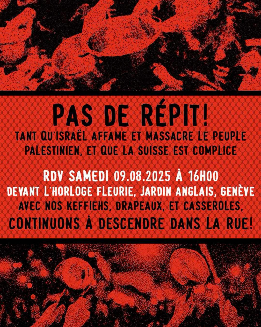 RDV samedi 9 août à 16h00 à la statue Suisse-Genève (à côté de l’horloge fleurie) avec vos keffieh, drapeaux et casseroles
