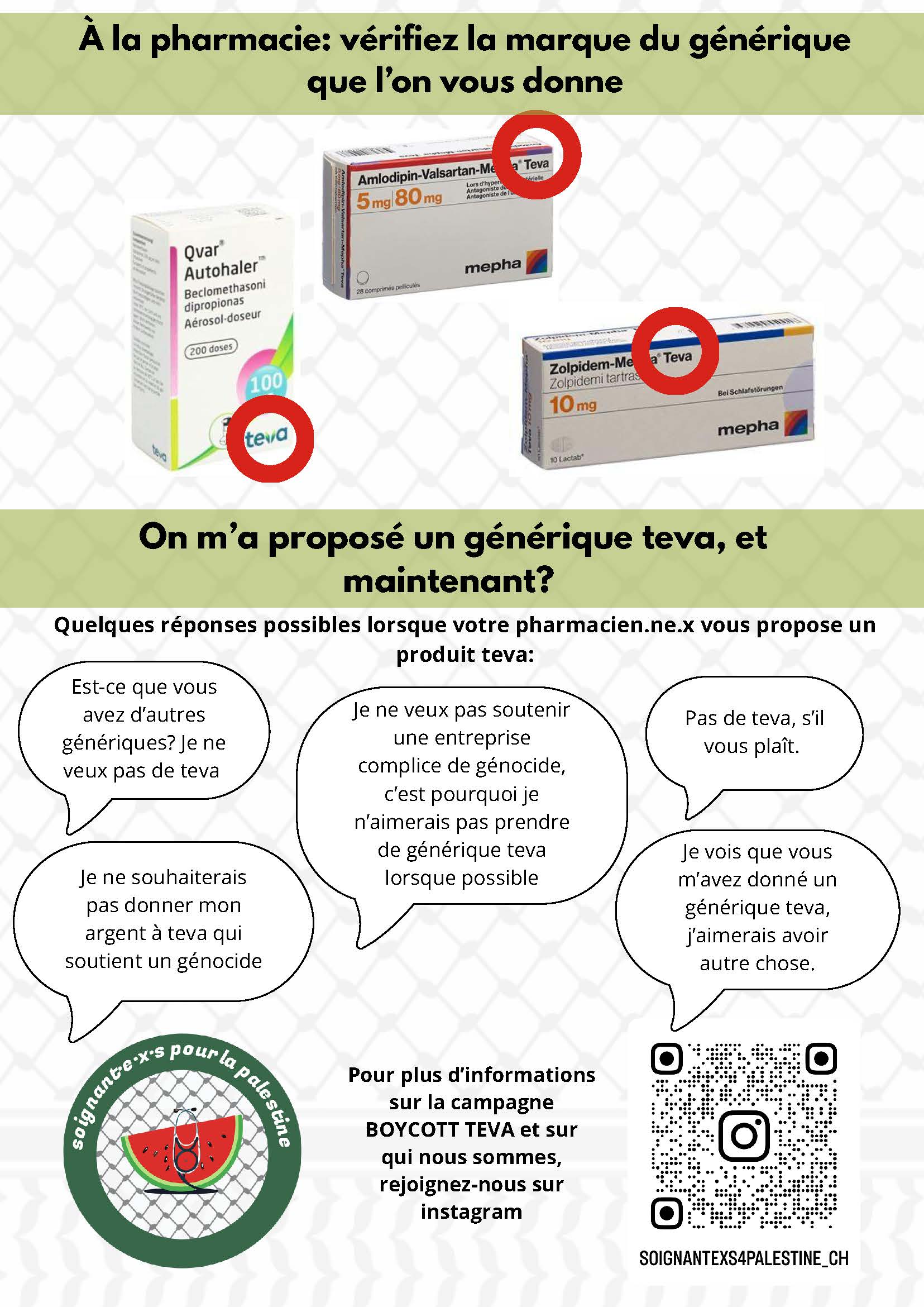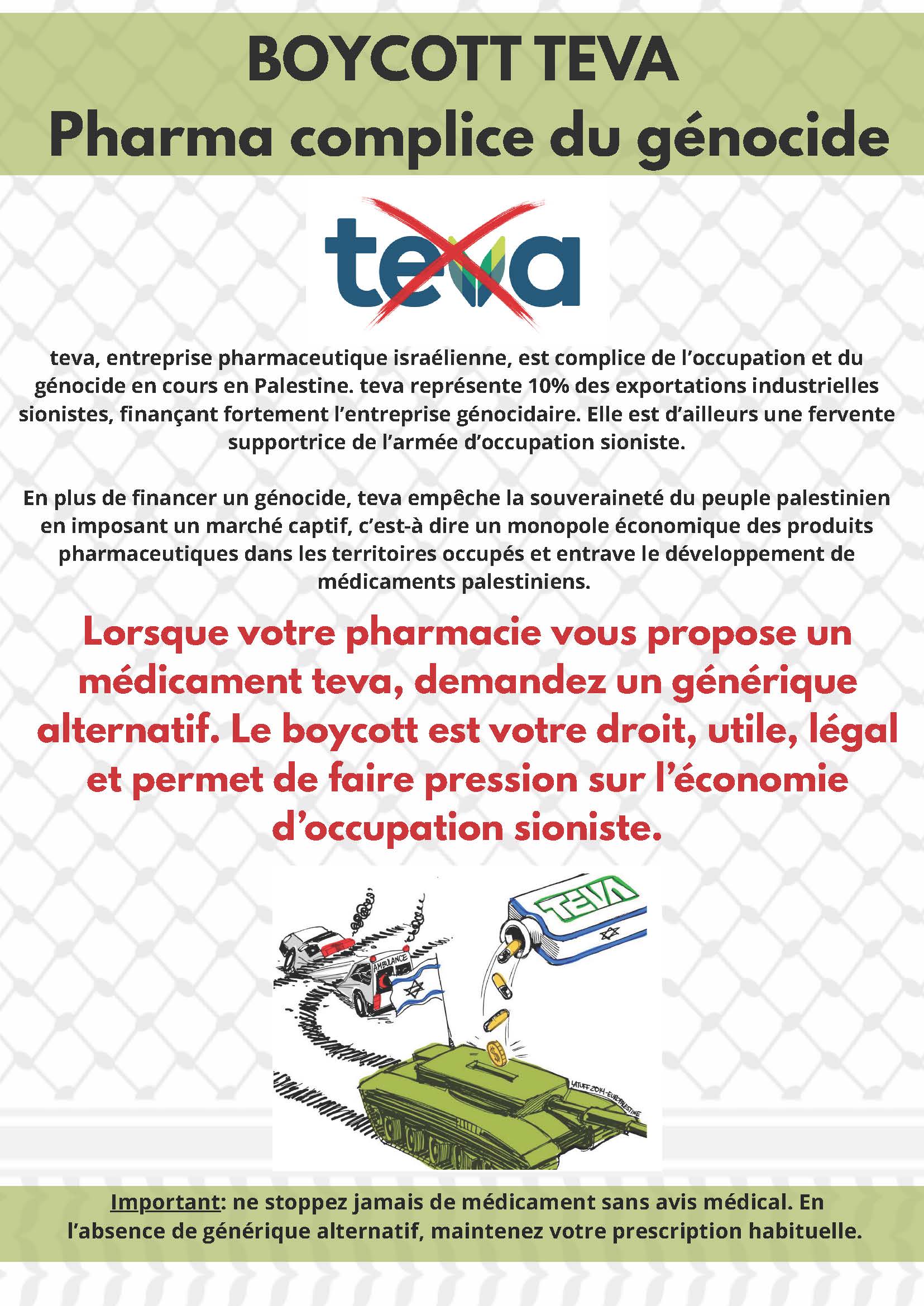 Le SIT soutient l’appel à boycott de Teva lancé par le collectif Soignant-e-x-s pour la Palestine et vous appelle à le suivre et à le relayer largement. Teva est un géant israélien des médicaments génériques dont les bénéfices participent activement au financement du génocide. Présent à l’international, ce géant pharmaceutique a notamment racheté l’entreprise Mepha, n°1 des génériques en Suisse.