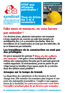 Pendant la dernière ligne droite avant la grève, plusieurs entreprises de la construction ont transmis à leurs employés un courrier d’intimidation au sujet des journées de mobilisation des 3 et 4 novembre prochains. Tous s’inspirent d’un courrier élaboré par la société suisse des entrepreneurs (SSE) – section Genève – dans le but évident de décrédibiliser le mouvement de lutte légitime des maçons.
