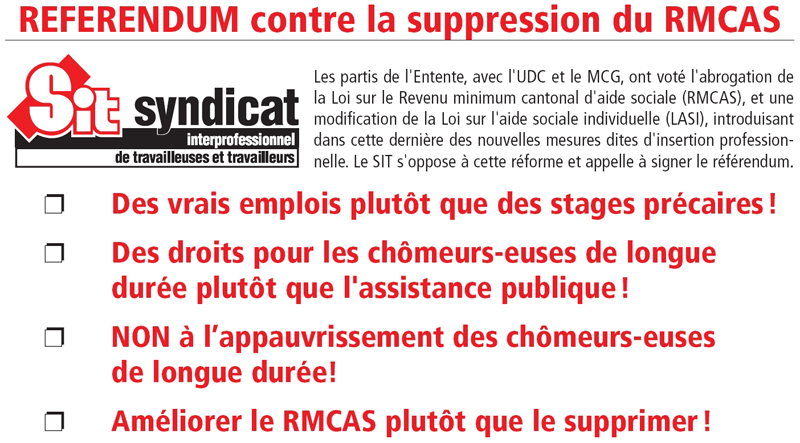 Alors que la 4e révision de la Loi fédérale sur le chômage, qui entrera en vigueur le 1er avril prochain, supprime les indemnités chômage à des milliers de chômeurs-euses, la réforme raye le droit à un Revenu minimum cantonal d’aide sociale pour ces derniers-ères. Privé-e-s de ce droit, ils-elles devront compter sur leurs propres ressources, où celles de leur conjoint-e-s, pour survivre. Et comme le seuil d’accès à l’aide sociale est très bas, ce n’est qu’une fois appauvri-e-s qu’ils-elles pourront et devront la demander pour un obtenir… un revenu inférieur à celui du RMCAS. Alors que d’autres cantons pensent à créer un dispositif intermédiaire entre le chômage et l’aide sociale, le Conseil d’Etat veut aujourd’hui supprimer le sien. Le RMCAS a pour but « d’éviter [aux chômeurs-euses en fin de droit] de devoir recourir à l’assistance publique » (art. 1 LRMCAS). Le maintien d’un tel dispositif intermédiaire est indispensable.