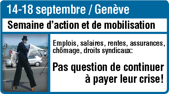 Dans la semaine qui précède la manifestation syndicale nationale, les syndicats genevois, la CGAS, dont le SIT, organisent des actions de mobilisation sur les lieux de travail : de soupe de crise en Assemblées syndicales et du personnel, de pauses prolongées en actions de dénonciation des effets de la crise, nous nous mobilisons pour défendre les emplois, les salaires, les rentes, les assurances et les droits syndicaux menacés par « leur » crise.