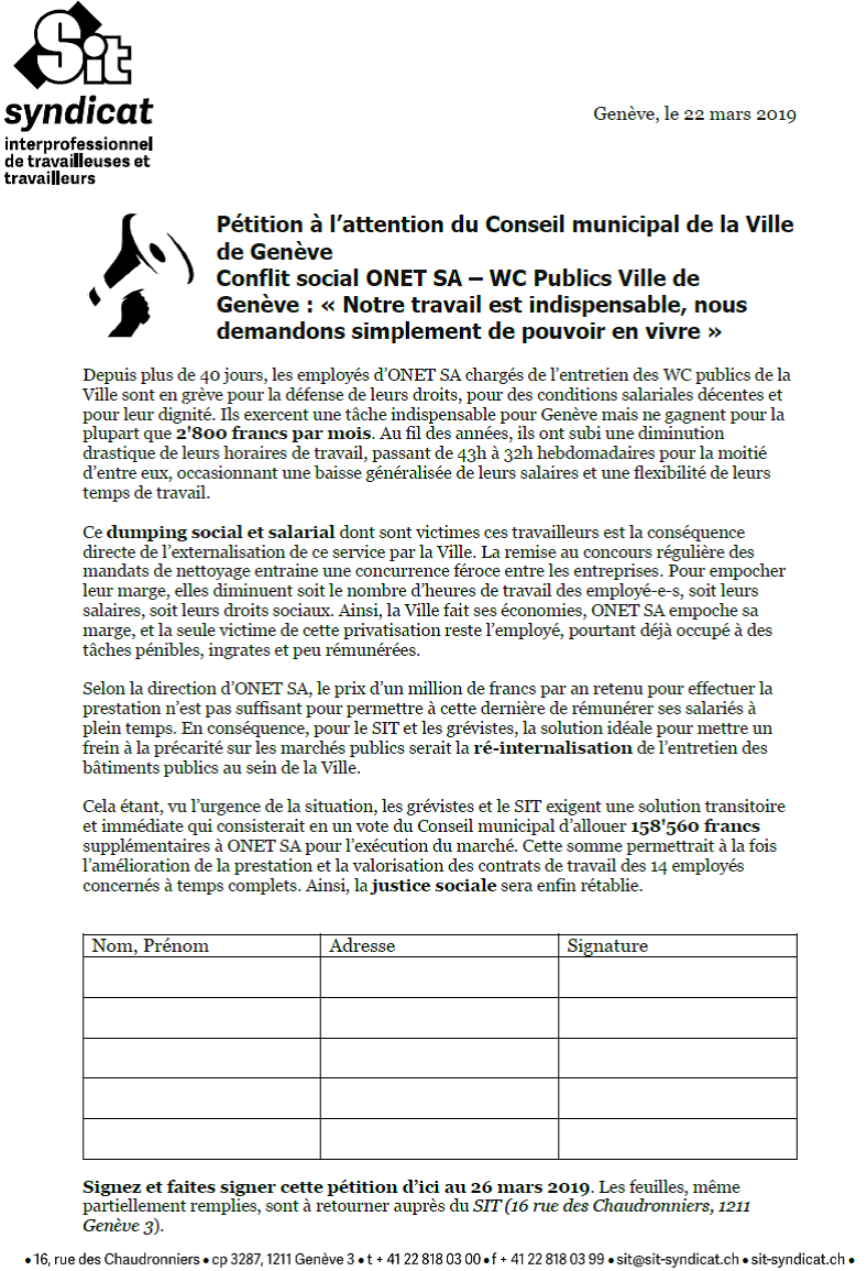 Pétition des travailleurs d’ONET SA à l’attention du Conseil municipal de la Ville de Genève