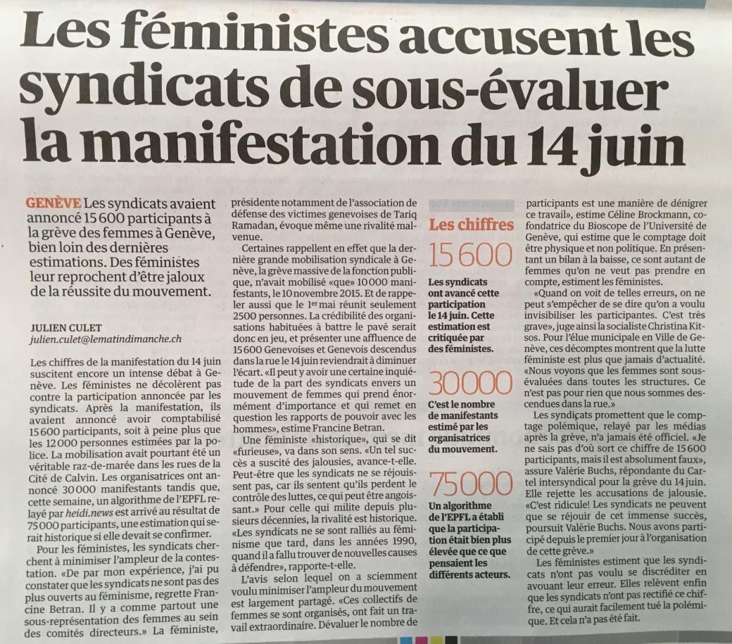 Suite à la polémique sur le nombre de participant-e-s à la manifestation genevoise du 14 juin 2019, et notamment à l’article paru dans le Matin dimanche du 7 juillet 2019 intitulé « Les féministes accusent les syndicats de sous-évaluer la manifestation du 14 juin », le Collectif grève féministe 2019 Genève et la Communauté genevoise d’action syndicale (CGAS) tiennent à apporter les précisions suivantes :