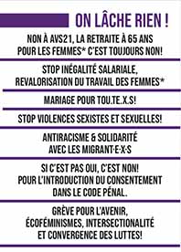Nous devons continuer à visibiliser nos revendications, nos espoirs et nos colères. La Pandémie a mis en lumière le travail essentiel des femmes, rémunéré comme non-rémunéré, et le manque de reconnaissance systémique accordé à notre travail ! Les violences sexistes et sexuelles sont plus souvent dénoncées, mais elles ne diminuent pas et ne sont pas encore prises au sérieux. L’absence de consentement doit être le critère retenu pour la détermination du viol.