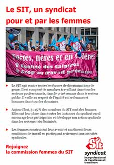 Le SIT agit contre toutes les formes de discriminations faites aux femmes. Vous retrouverez dans cette brochure les enjeux liés aux inégalités salariales, à l’indépendance économique des femmes, au partage des tâches éducatives, à la discrimination des femmes migrantes, au harcèlement sexuel etc.