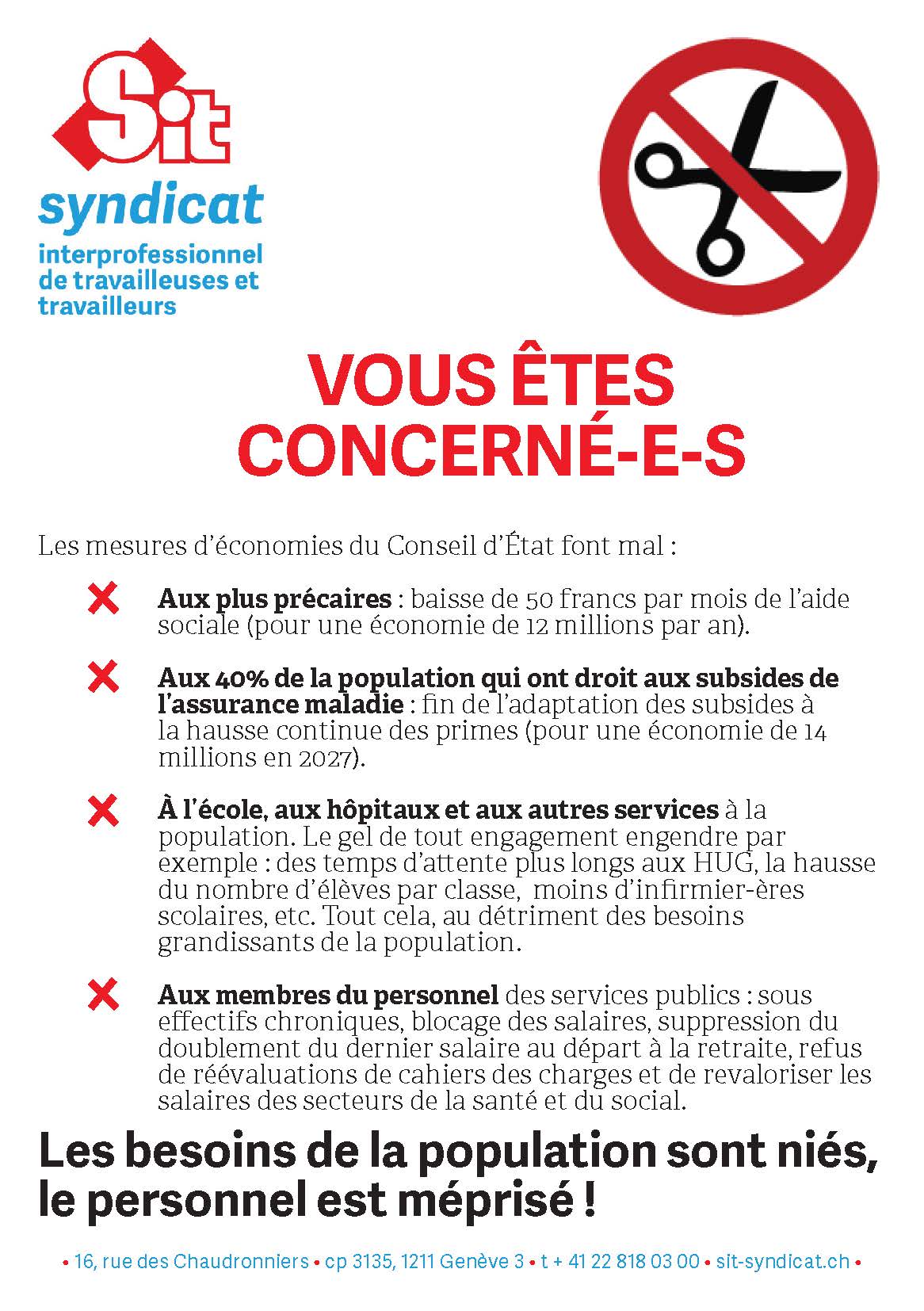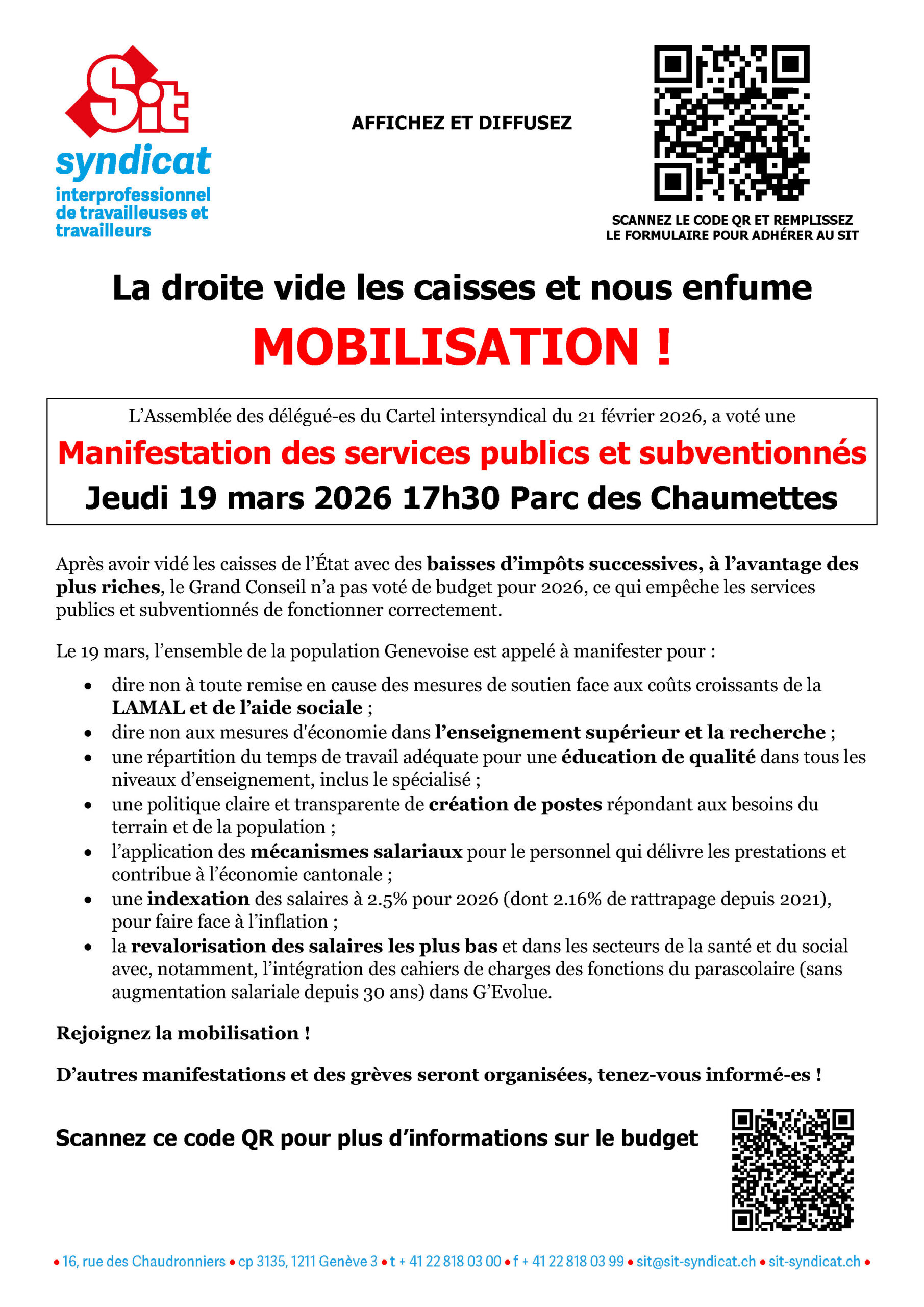 C’est le moment de relancer une forte mobilisation afin de signaler clairement au Grand Conseil et au Conseil d’État que Genève ne va pas accepter les mensonges de la droite et l’austérité pour financer les cadeaux fiscaux aux plus riches !