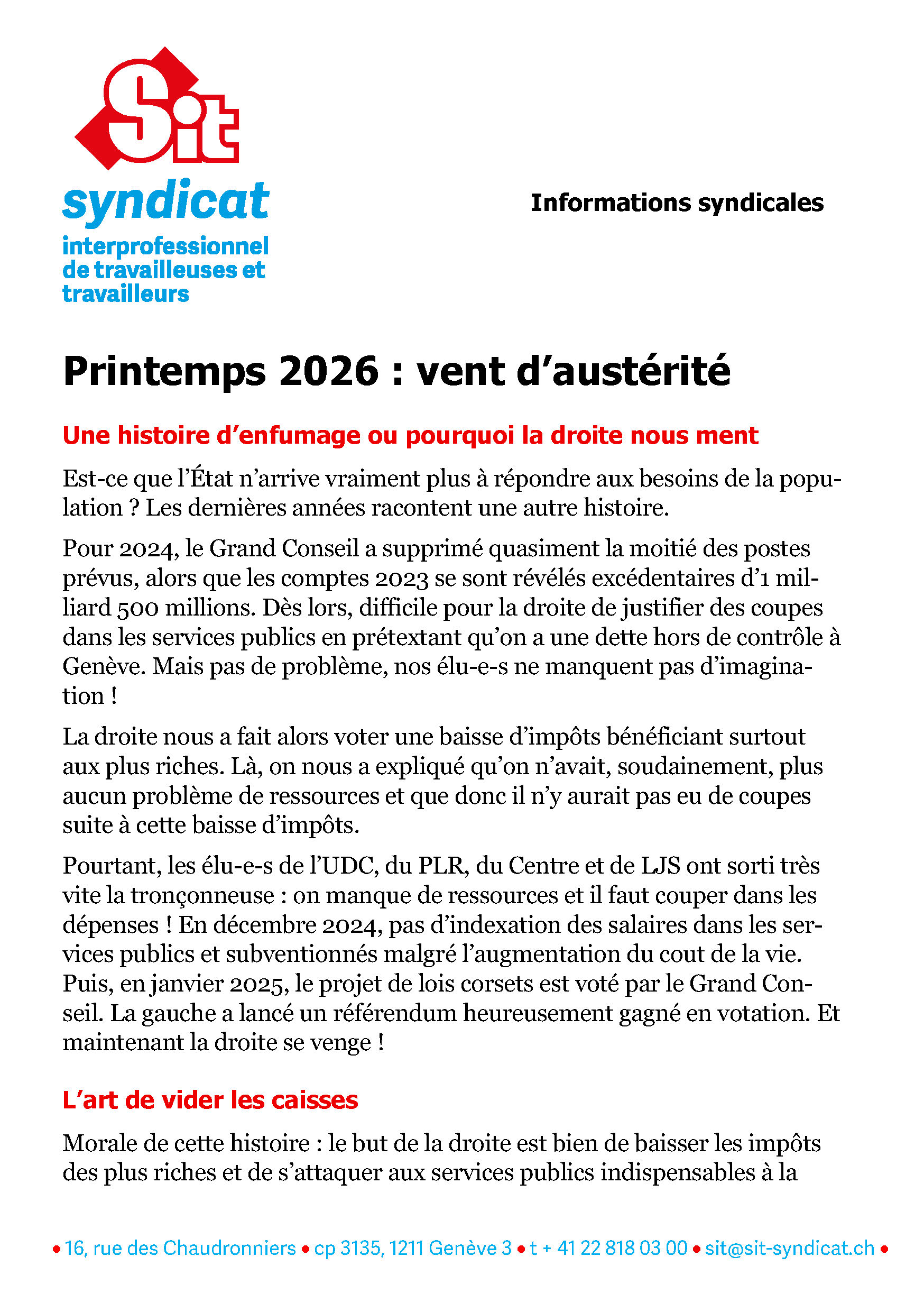 Malgré la mobilisation de plus de 4 000 travailleuses et travailleurs en décembre, le Grand Conseil a refusé le projet de budget 2026. Maintenant, le Conseil d’État doit proposer un nouveau projet de budget avant le 31 mars. Il faut s’attendre à un projet à nouveau d’austérité…