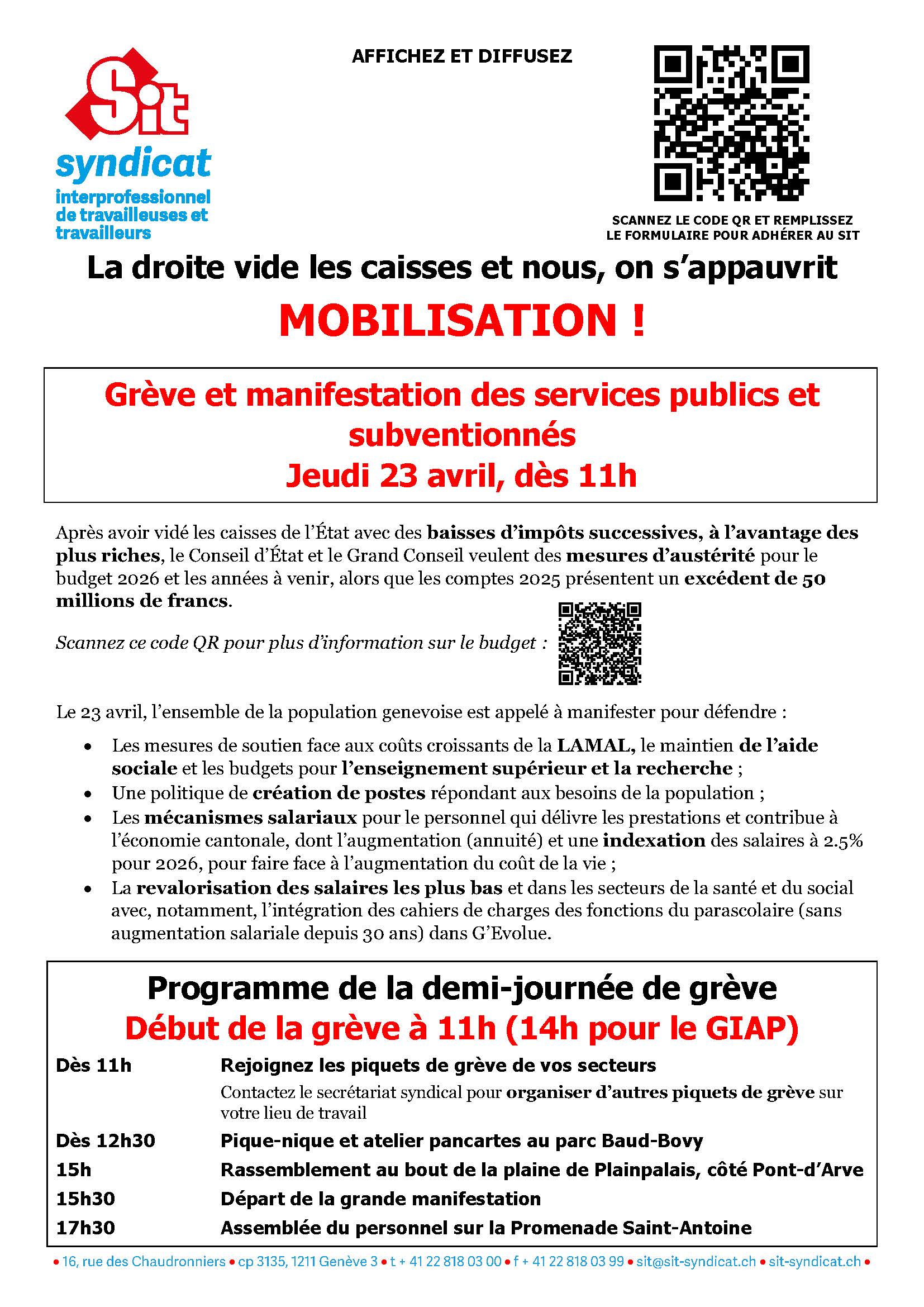 C’est le moment de relancer une forte mobilisation afin de signaler clairement au Grand Conseil et au Conseil d’État que Genève ne va pas accepter les mensonges de la droite et l’austérité pour financer les cadeaux fiscaux aux plus riches !