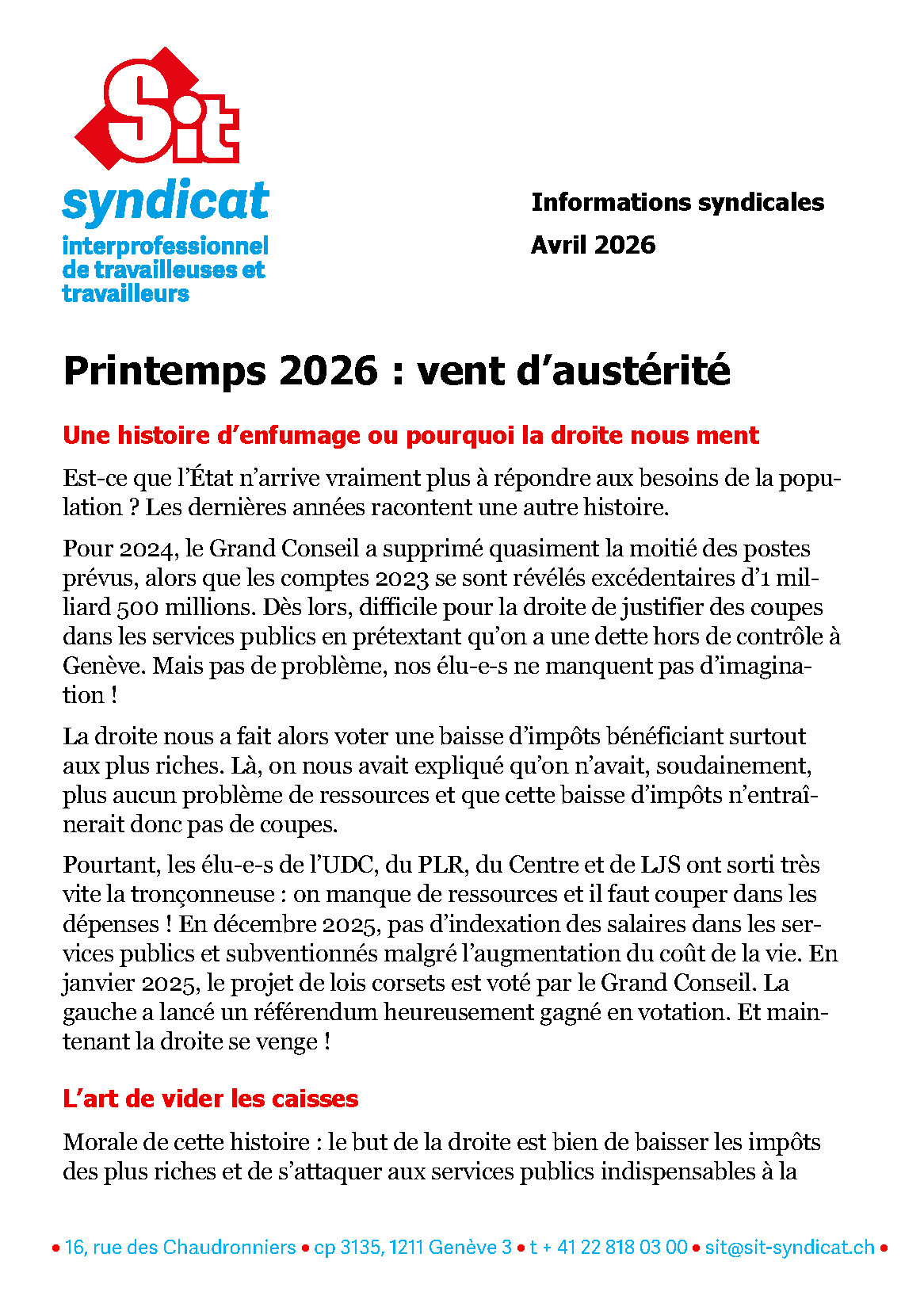 Suite au refus du projet de budget 2026 en décembre par la majorité de droite du Grand Conseil, qui exigeait des économies de 300 millions, le Conseil d’État a proposé un nouveau projet de budget, copié-collé du précédent. Il gèle les postes et les salaires et soutient le discours de l’austérité. Malgré l’excédent de 50 millions en 2025, le Conseil d’État est incapable de proposer une politique sociale répondant aux besoins de la population. Est-ce que l’État ne peut vraiment plus répondre à ces besoins ? Bien sûr que non ! Il s’agit au contraire d’une orientation politique assumée de la droite, qui baisse les impôts des plus riches et s’attaque aux services publics en servant ainsi les intérêts des plus privilégié-e-s.