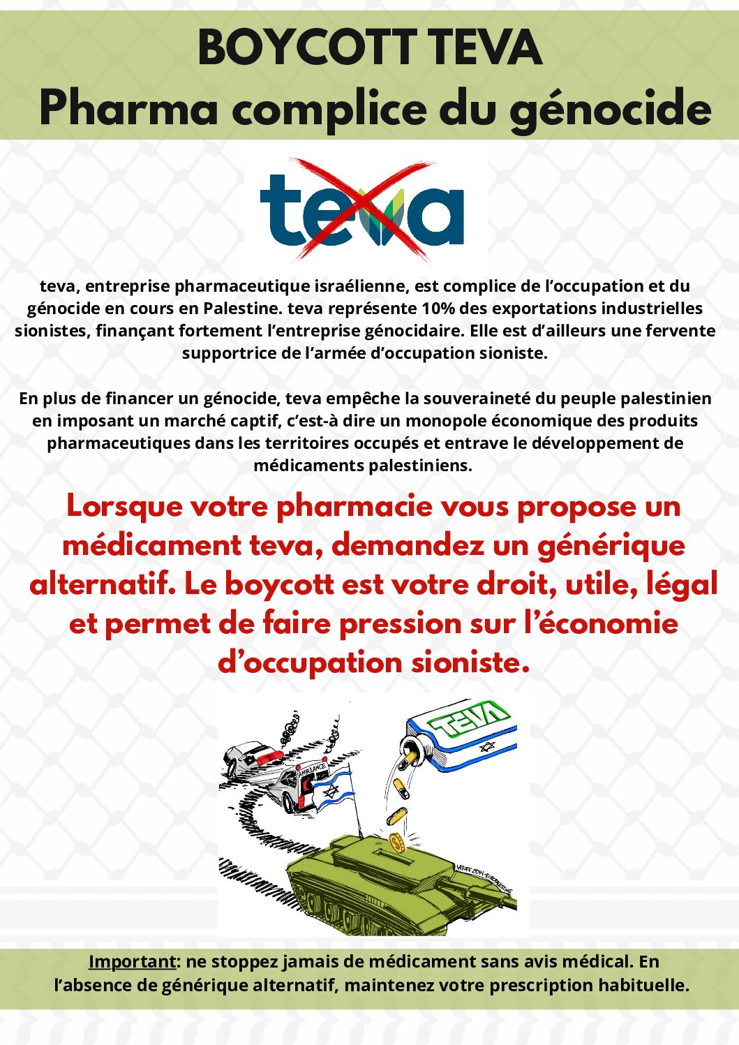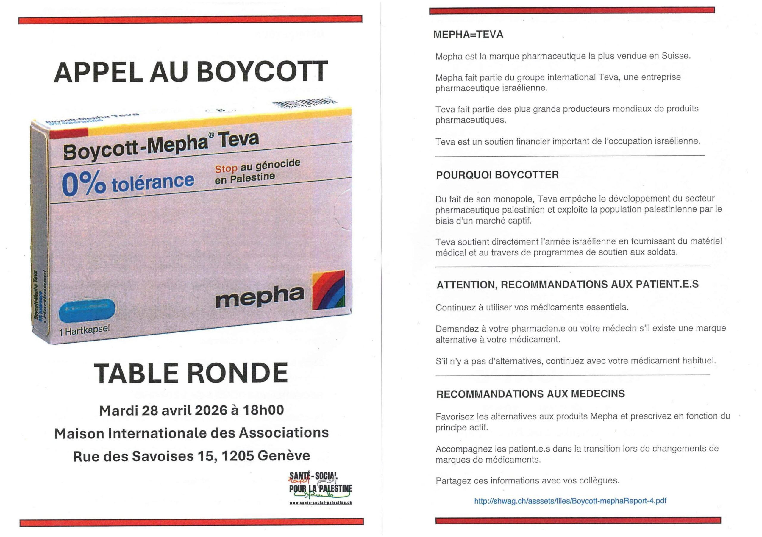 Le SIT soutient l’appel à boycott de Teva/Mepha lancé par le collectif Soignant-e-x-s pour la Palestine et vous appelle à le suivre et à le relayer largement. Teva est un géant israélien des médicaments génériques dont les bénéfices participent activement au financement du génocide. Présent à l’international, ce géant pharmaceutique a notamment racheté l’entreprise Mepha, n°1 des génériques en Suisse.