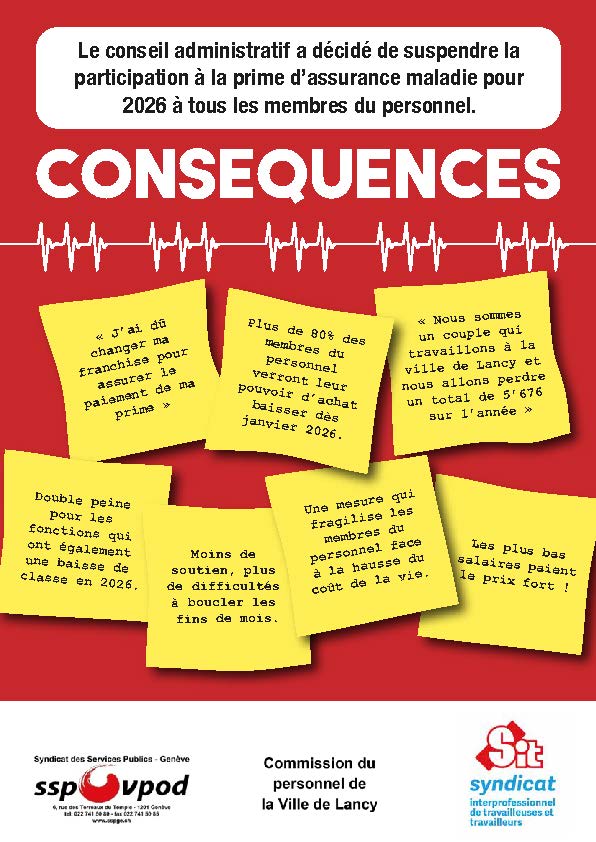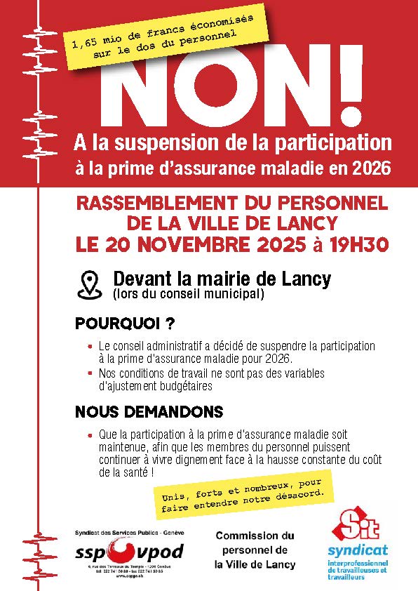 Les syndicats SIT et SSP ainsi que la Commission du personnel de la Ville de Lancy appellent à un rassemblement