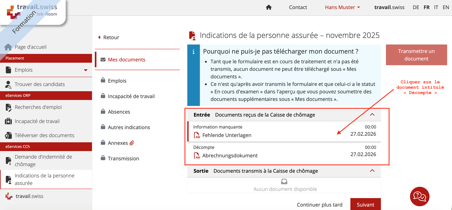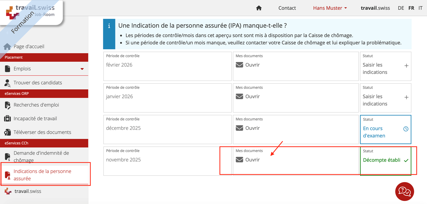 - Sur Job-Room, dans le panneau latéral à gauche, cliquer sur « Indications de la personne assurée » (sous l’onglet eServices CCh) ;